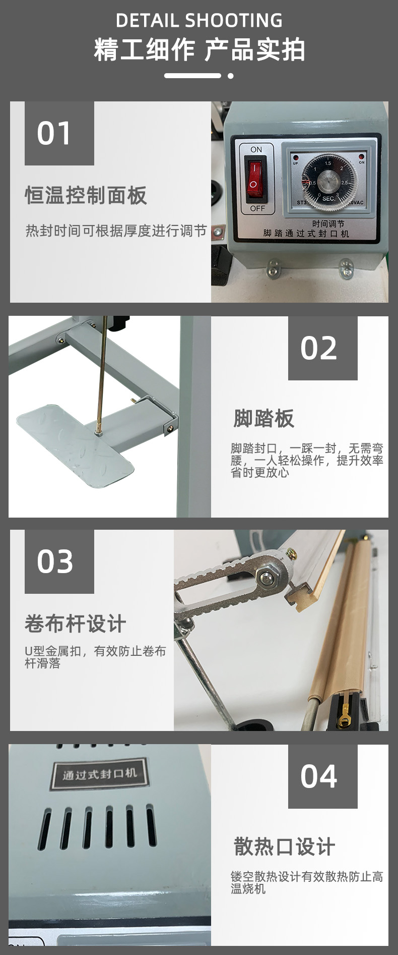 - 封口美觀度:要實(shí)現(xiàn)封口平整、無(wú)褶皺、無(wú)焦痕等美觀效果,需要精確的溫度控制和合適的功率。對(duì)于對(duì)封口美觀度要求高的產(chǎn)品,功率不能過(guò)大或過(guò)小,過(guò)大易造成焦痕,過(guò)小則封口不平整,通常 700 - 900W 的功率在合理調(diào)節(jié)下能滿足大多數(shù)此類需求。