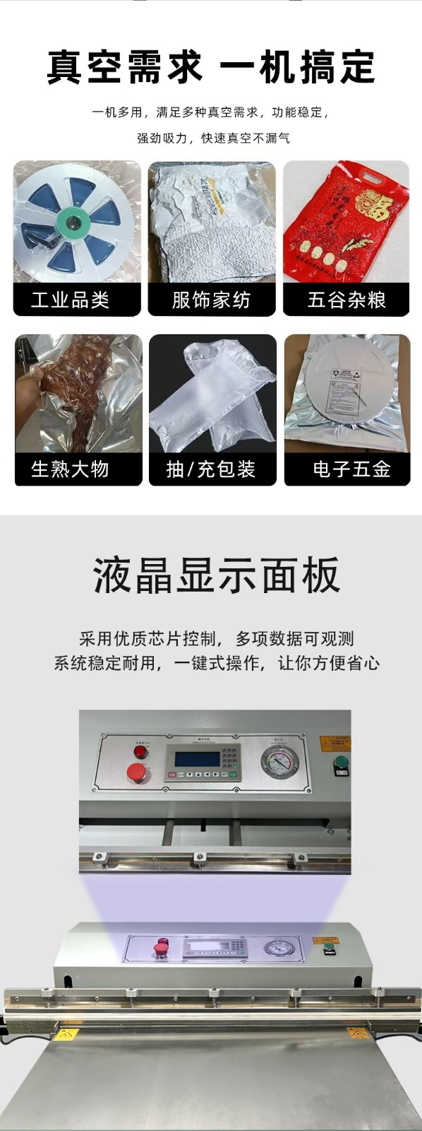 外抽真空包裝機(jī)不受包裝容器形狀和尺寸限制,無論是大型工業(yè)零部件還是小型家用物品,只要抽氣口能與抽氣嘴連接,均可進(jìn)行真空包裝