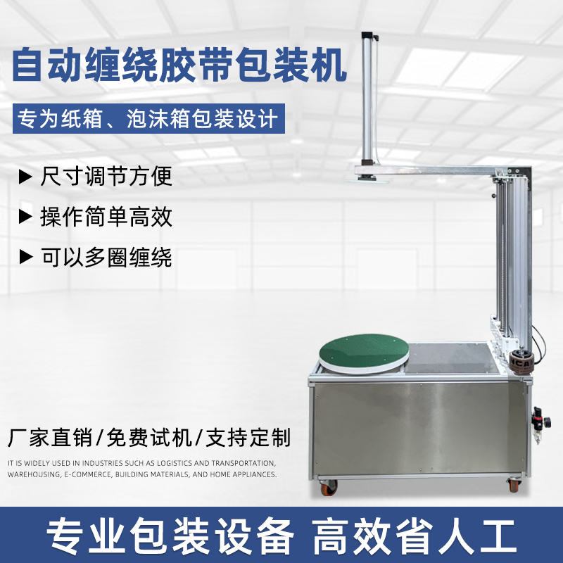 - 貨物纏繞機(jī):主要用于托盤貨物、大型設(shè)備等的包裝,通過旋轉(zhuǎn)工作臺(tái)帶動(dòng)貨物旋轉(zhuǎn),同時(shí)膠帶從上方或側(cè)面進(jìn)行纏繞,如常見的物流倉(cāng)儲(chǔ)用膠帶纏繞機(jī)。