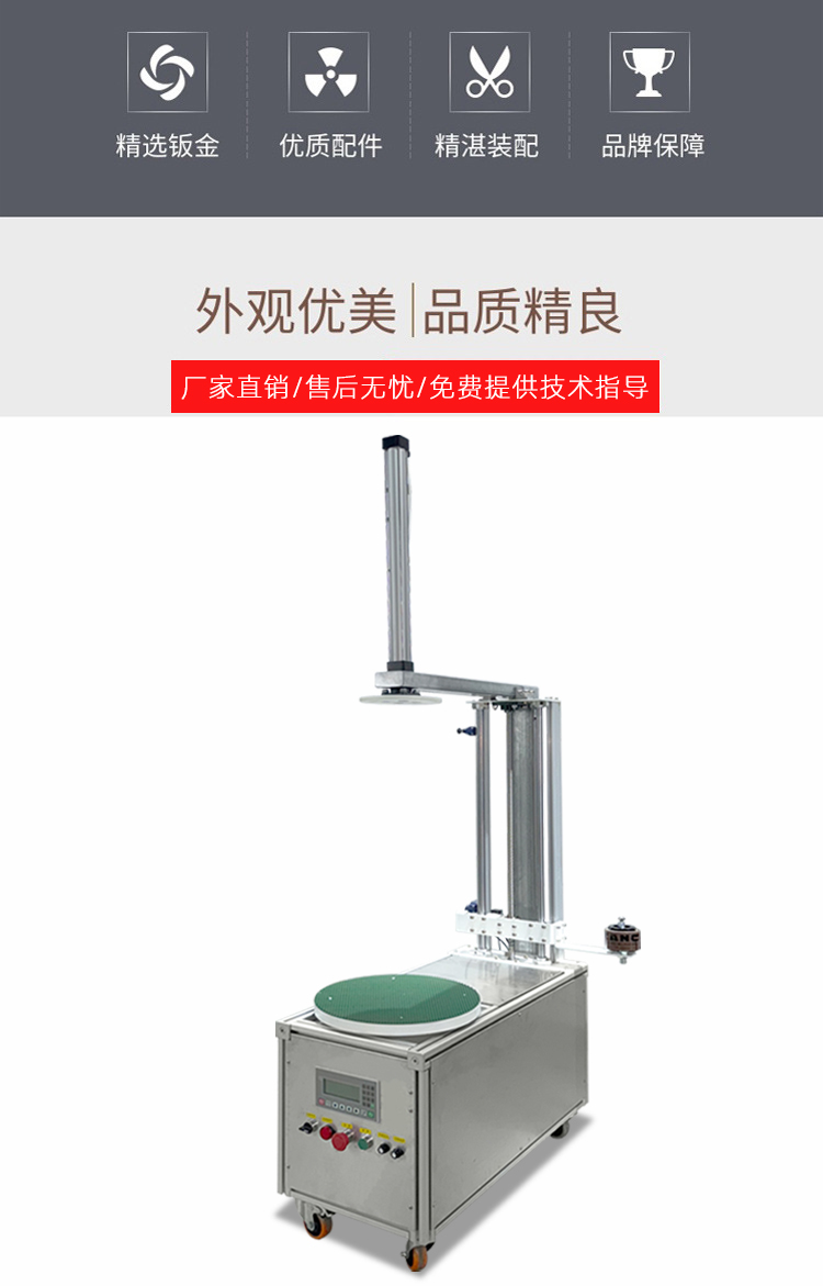 - 高效連續(xù)作業(yè):無(wú)需人工固定薄膜、剪斷收尾,從貨物上料(搭配流水線可全自動(dòng)上料)到纏繞完成僅需 30-90 秒 / 件,單臺(tái)設(shè)備每小時(shí)可處理 40-120 件貨物,是人工纏繞效率的 5-8 倍。