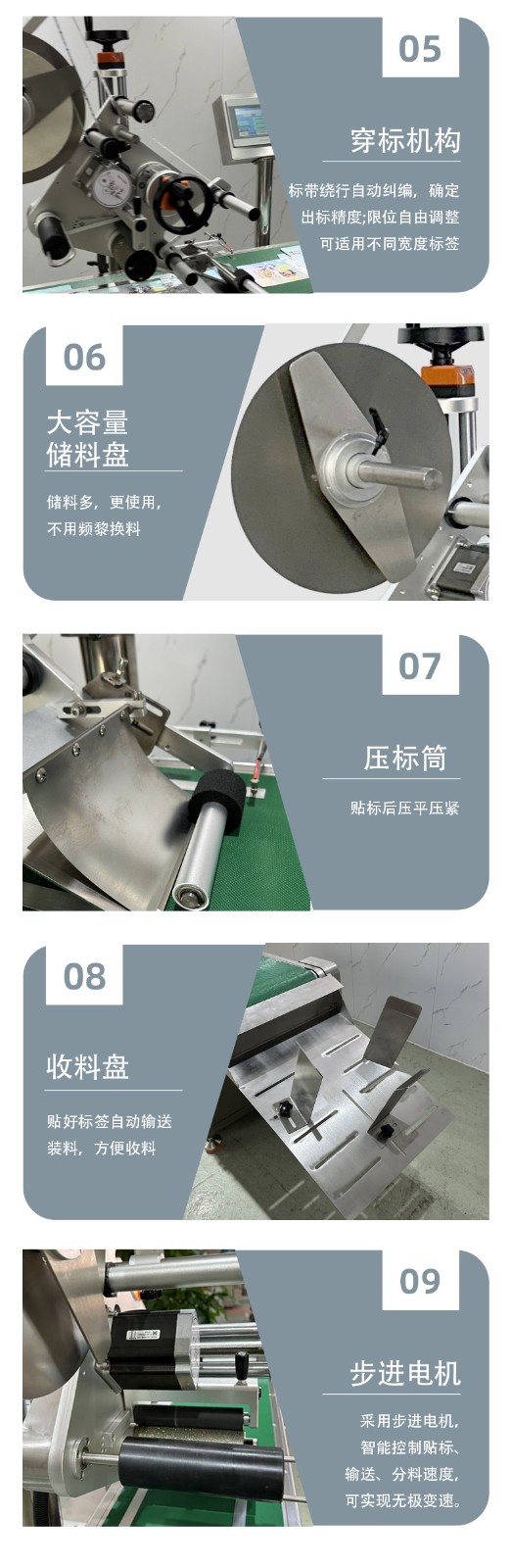 貼標(biāo)精度高:采用細(xì)分步進(jìn)電機(jī)或伺服電機(jī)驅(qū)動送標(biāo),搭配標(biāo)帶繞行糾偏機(jī)構(gòu)和偏心輪牽引機(jī)構(gòu),確保出標(biāo)精準(zhǔn),貼標(biāo)精度可達(dá) ±1mm。