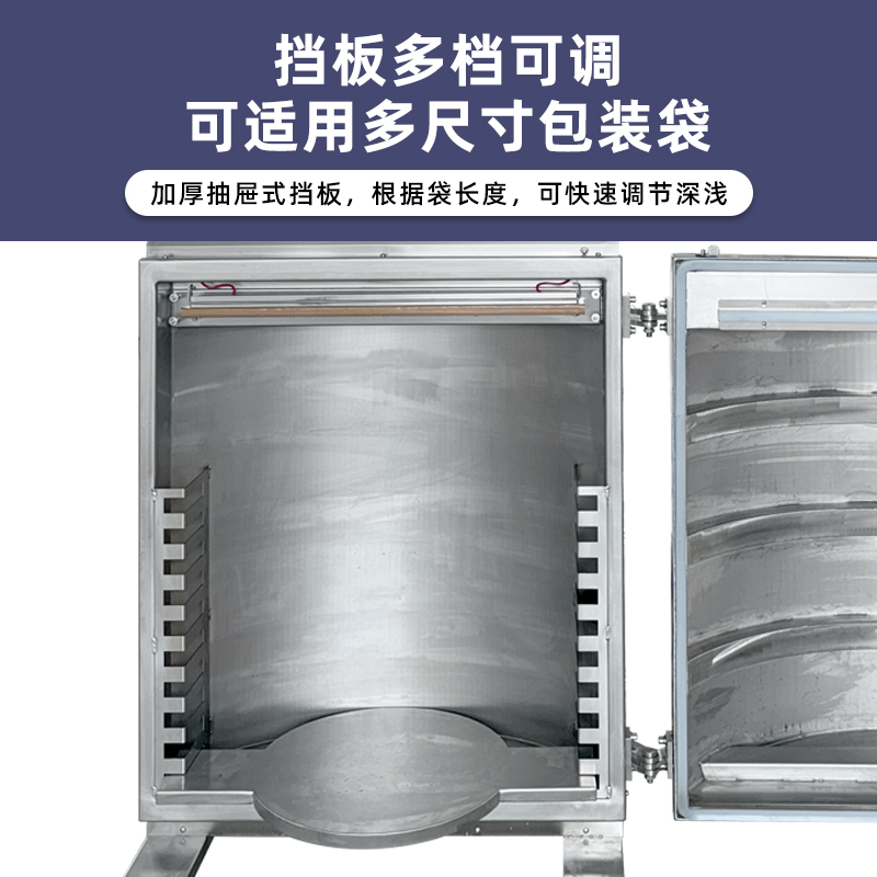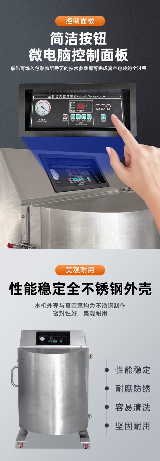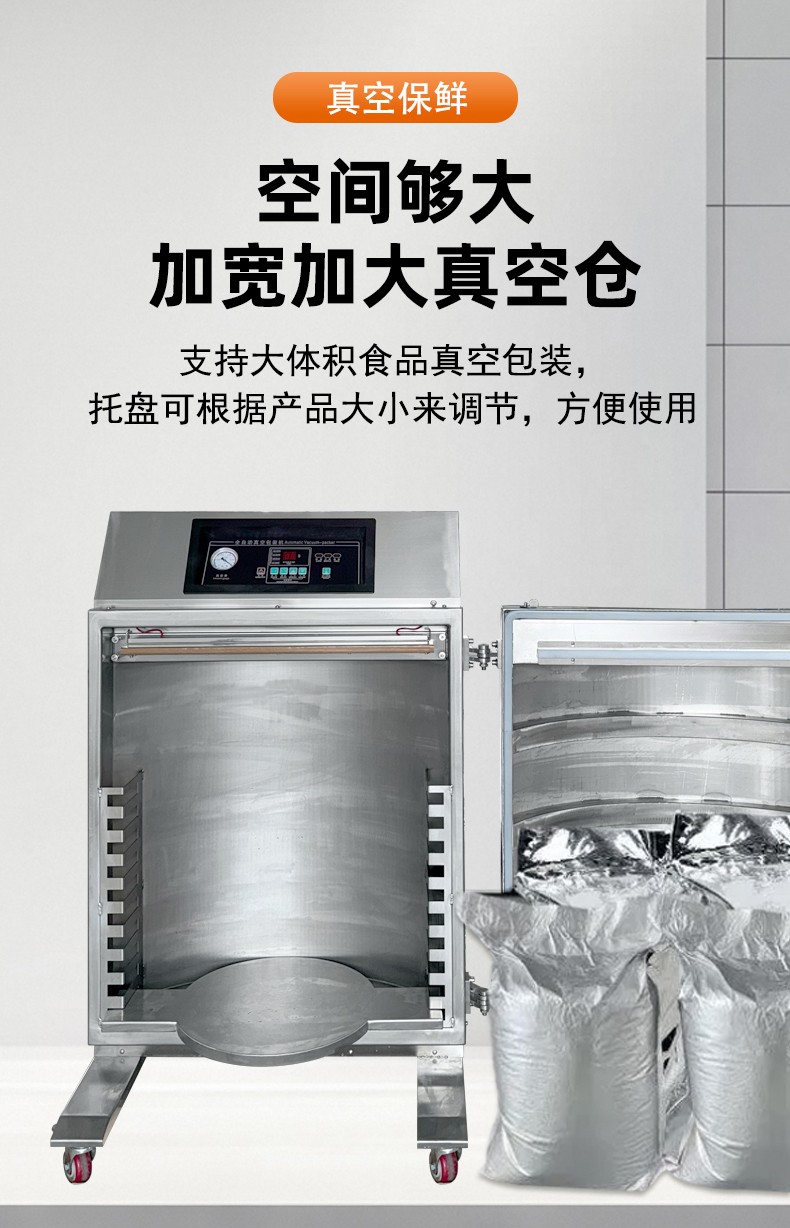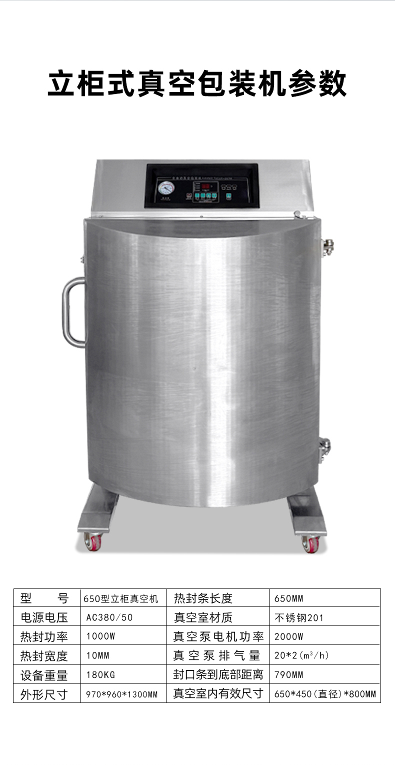 - 大容量真空室:立柜式真空包裝機的真空室容積較大,如 DZ-650L 型號,其熱封有效尺寸可達 650×8mm,可同時處理大批量食材或大尺寸包裝,能滿足整只火腿、海鮮禮盒、大桶粉末顆粒等特殊形狀物品的封裝需求49。