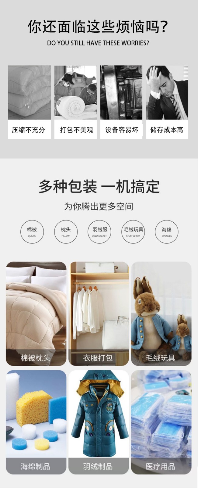 真空壓縮封口機:集成抽真空功能,先抽走包裝內(nèi)空氣(如食品袋、零件袋),再加壓封口,適合需要防潮、保鮮、防氧化的場景(如肉類真空包裝、精密零件防銹包裝)。